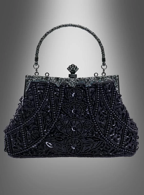 Suchen Sie eine Handtasche im 20er Jahre Stil für Ihr Charleston Kostüm? Diese wunderschöne Bügeltasche passt garantiert zu allen Pailletten Kostümen und Fransenkleidern. Denn schwarz kann man fast zu allem tragen.