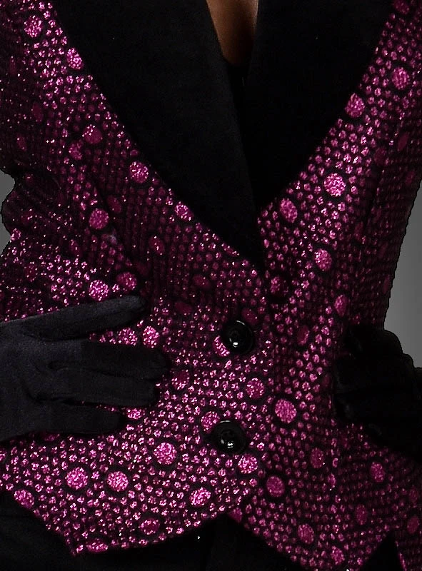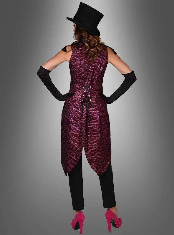 Für besondere Auftritte braucht man Sexappeal, Glanz und Glamour. All das bietet der Damenfrack im Cabaret Stil. Der ärmellose Frack glänzt metallisch pink auf schwarzem Grund und sieht einfach edel aus. Vorne ist der Frack kurz wie eine Herrenweste geschnitten, hingen lang. Zwei Knöpfe schließen die Jacke und am breiten, schwarzen Samt-Kragen sind zwei weitere Knöpfe zur Zierde angenäht. Im Rückenbereich ist eine Schnürung, mit der man die Taille regulieren kann. Auf den Schultern sind Epauletten mit Fransen angenäht, was diesen Damenfrack zusätzlich bereichert. Der Frack von toller Qualität kann bei 30 Grad gewaschen werden.