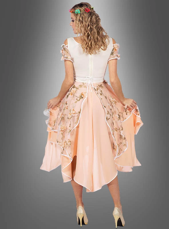 Ein Frühlingstraum in Apricot ist dieses Blumenfee Kleid mit Stoffblüten. Märchenhafte Verkleidung für Damen zum Karneval oder zur Mottoparty.