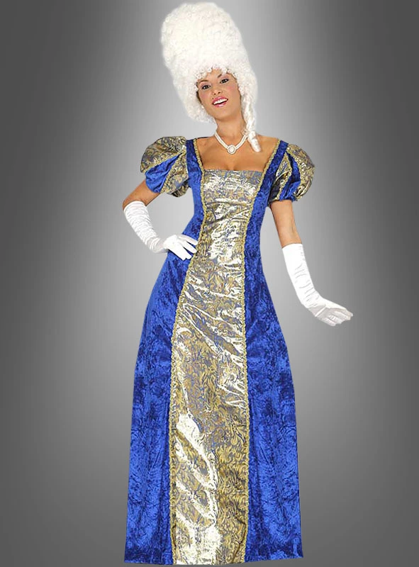 Langes Kleid aus blauem Pannesamt mit einer rechteckigen Ausschnittlösung. Die schönen Puffärmel sind zweifarbig gestaltet. Im vorderen Bereich ist ein glänzender Brokatstoff eingenäht. Der Stoff glänzt golden und ist mit schönem Rankenmuster durchwebt. Goldene Borten verzieren das schöne Barockkostüm zusätzlich. Ein langer Reißverschluss im Rückenbereich erleichtert das An- und Auskleiden. Durch angenähte seitliche Samtbänder können Sie das lange Kleid noch zusätzlich im Rücken zusammenbinden und so Ihre Taille betonen. Mit dabei ist auch ein kurzer, versteifter Unterrock, der der oberen Partie des Rockteils etwas mehr Weite verleiht.