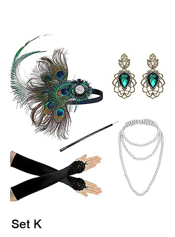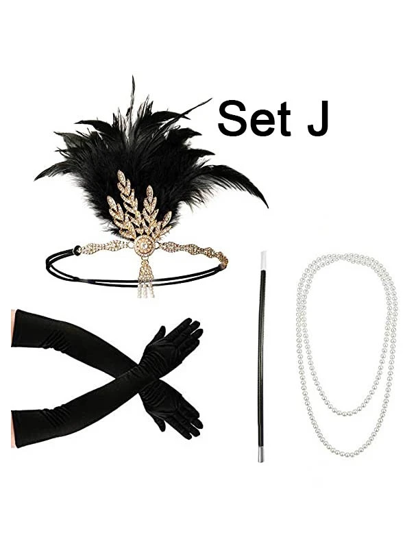 Bei den Sets ist immer ein Haarband Kopfschmuck mit echten Federn dabei. Perlenketten, die in den 20er Jahre sehr beliebt waren und ein langer Zigarettenhalter sind geradezu ein Must-have bei Golden Twenties Partys. Wenn Ohrringe im Set sind, dann benötigen Sie hier auf jeden Fall durchstochene Ohrläppchen. Denn es handelt sich um Ohrstecker. Die langen Galahandschuhe oder Armstulpen sehen sehr elegant aus.