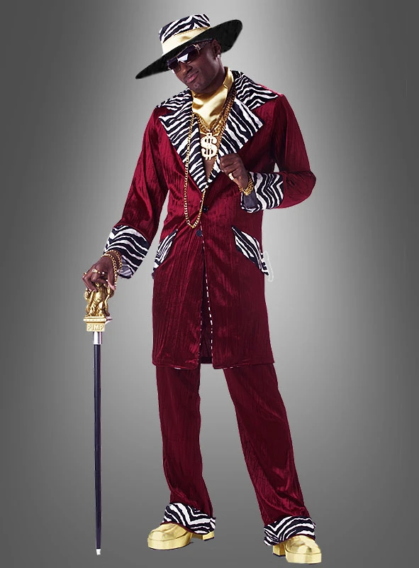 Das Zuhälterkostüm Pimp Daddy ist aus weichem, weinroten Samtstoff gefertigt. Der elegante Longblazer ist vorne knöpfbar und mit Ärmelaufschlägen, breitem 70er Jahre Kragen und Taschenaufschlägen (Zierde) aus bedrucktem schwarz-weißem Samt im Zebra-Look genäht.