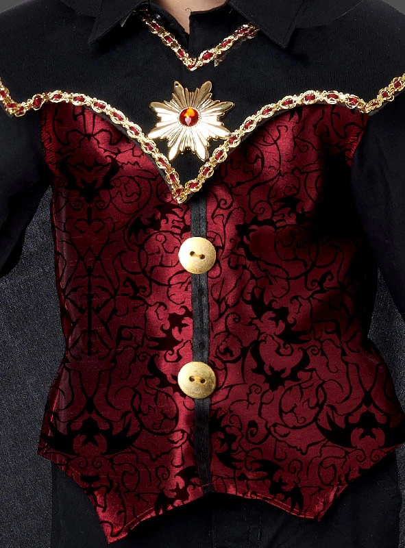 Als edler Dracula im Kostüm trägt man auch als kleiner Junge schon ein angemessenes Gewand. Das feine Vampirkostüm für Kleinkinder besteht aus einer dunkelroten Weste mit feinem Samtmuster, auf dem Fledermäuse und Ranken zu sehen sind. Die goldenen Zierknöpfen sehen toll aus. Darüber trägt der kleine Vampir einen mit Schaustoff verstärkten hohen Kragen, an dem im Hals und Brustbereich goldene Borte angenäht ist. Der tolle Umhang, der am Saum wie Fledermausflügel geschnitten ist. Der Umhang ist am Kragen befestigt. Das Amulett mit dem roten Edelstein wird auf dem Kragen mit Klettverschluss befestigt. Da kann nichts Stechen.