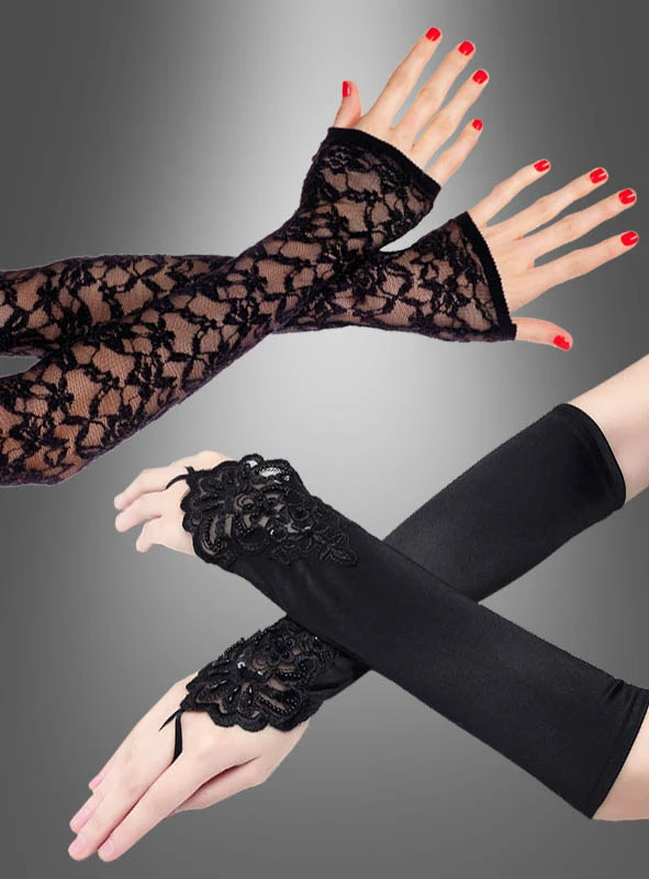 Diese fingerlosen Handschuhe sind lang und sollten in keinem Kleiderschrank fehlen! Sie sind wie lange schwarze Armstulpen gearbeitet, aus Spitzenstoff und edel im Design. Passend zu vielen Kostümideen wie Gothic Kleider, Vampirkostüme, Steampunk Outfit oder auch 80er Jahre Popstars Verkleidungen wie Madonna oder Cyndi Lauper.