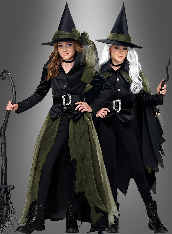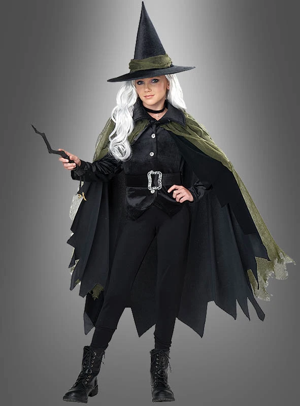 Für Mädchen ist dieses Hexenkostüm einfach toll! Denn jedes Kind liebt es sich zu verkleiden und verschiedene Styles zu probieren. Der Hut kommt zweigeteilt und wird einfach mit wenigen Handgriffen zusammengebaut. Der schöne Tüllstoff mit der Schleife wird darumgebunden. Die schwarze Jacke aus weichem Samt wird vorne geknöpft. Der Clou ist der lange Überrock, der aber auch als Cape getragen werden kann. Der breite Gürtel mit der schönen Zierschnalle aus Kunststoff rundet das Hexenkostüm für Mädchen ab.