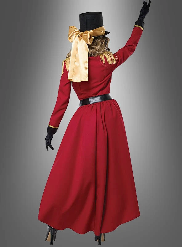 Dieses Kostüm ist extravagant geschnitten und erregt Aufsehen. Über dem schwarz-weiß gestreiften Minikleid ohne Ärmel trägt die Zirkusdirektorin einen weit geschnittenen, roten Mantel, der mit einem schwarzen Gürtel aus Kunstleder mit goldener Schnalle in der Taille gehalten wird. Der breite schwarze Kragen aus Glanzstoff sieht edel aus. Auf den Schultern sind goldene Epauletten mit Klett befestigt, was den Uniform Charakter unterstreicht. Der rote Mantel ist hinten länger als vorne und lässt vorne den Blick auf das Kleid darunter offen. Die goldenen Knöpfe sind nicht nur zur Zierde angenäht. Sie können den Mantel auch offen tragen.