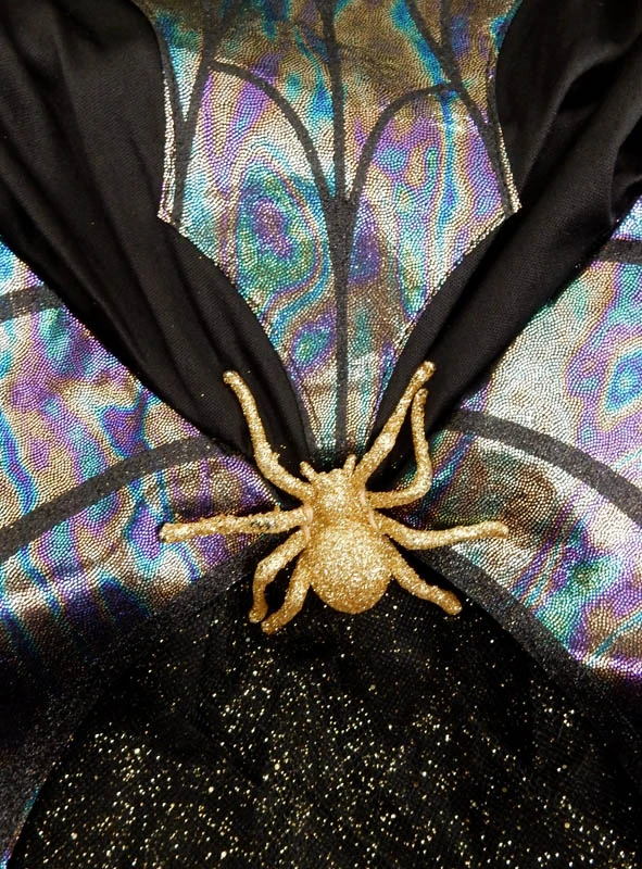 Leider sind die traumhaft schillernden Farben auf dem Spinnenkostüm für Mädchen hier beim Produktbild kaum zu sehen. Das schwarze Kleid ist mit glitzerndem Tüllstoff überzogen. Vorne im Brustbereich sowie seitlich über dem Rock sind die bunt schillernden und irisierenden Applikationen aufgenäht. Der glänzende Stoff schimmert in allen Regenbogenfarben und ist mit einem schwarzen Spinnennetzmuster überzogen. An den transparenten Ärmeln sind die Spinnennetz Flügel angenäht. Das Netz ist mit goldenem Glanzstoff angebracht. Das Kinderkostüm sieht sehr edel aus. In der Taille vorne verziert eine große Spinne das Halloweenkostüm, die mit goldenem Glitter überzogen ist.