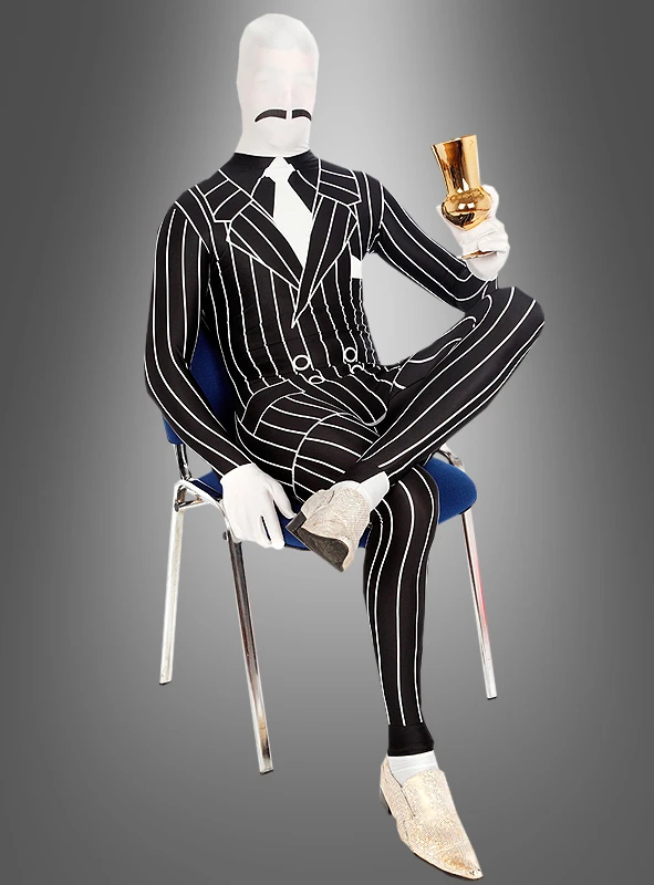Al Capone lebt! In diesem Morphsuit kannst du dich wie sein Handlanger fühlen. Im edlen Nadelstreifenanzug mit Krawatte erledigst du kleine Aufgaben für den Paten. Lustiger Ganzkörperanzug im 20er Jahre Mafia Style.