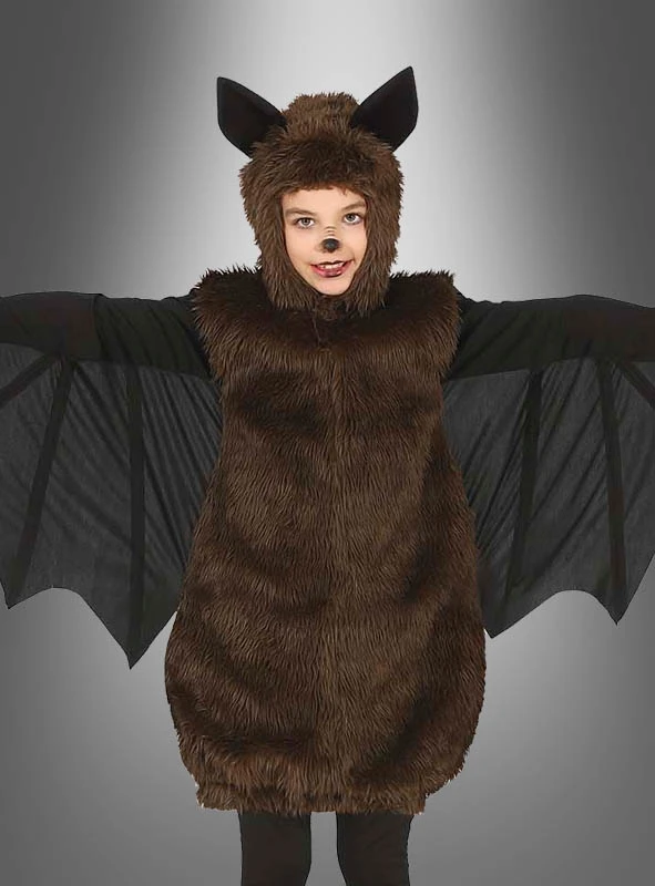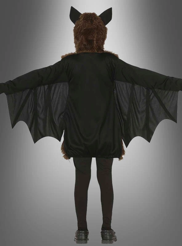 Auch die Kapuze aus braunem Plüsch ist angenäht. Die schwarzen Fledermausohren ebenfalls. Ein wunderbares Kostüm, mit dem Kinder ganz bestimmt viel Spaß haben werden.