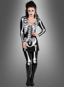 Sie können die längere Tunika auch ohne die Leggings sehr gut als kurzes Kleid tragen. Das Kostüm ist sehr figurbetont und hebt die weiblichen Formen hervor. Auch wenn die Tunika und die Leggings nicht viel Haut sehen lassen, ist der Skelettanzug für Damen dadurch sehr sexy.