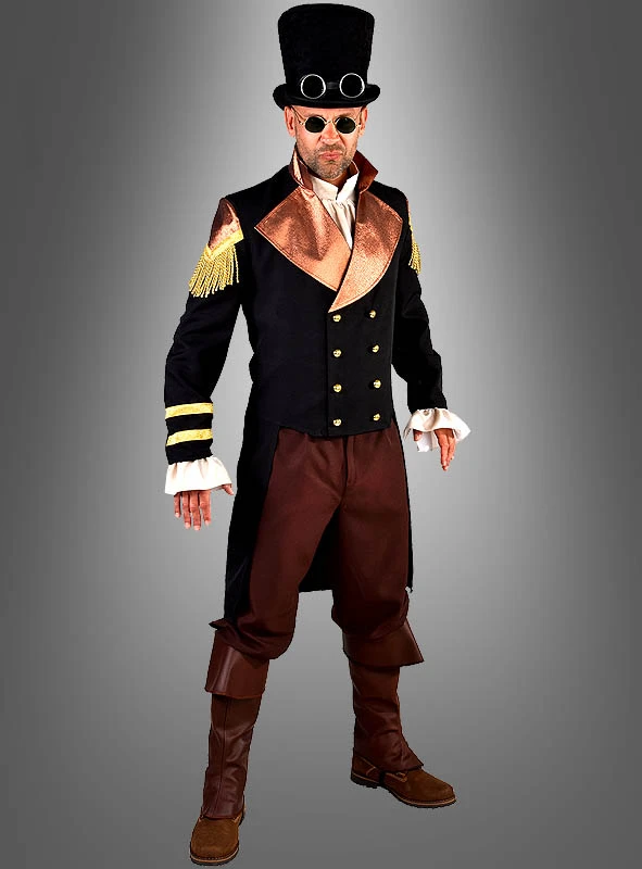 Der schwarze Frack ist im militärischen Design gefertigt mit goldenen Rangstreifen an einem Ärmel und Epauletten auf den Schultern. Mit diesem Kostüm werden Sie zum Steampunk Offizier.