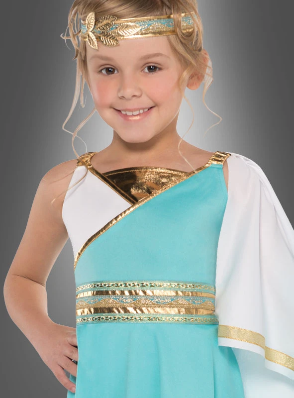 Das deluxe griechische Göttin Kleid für Mädchen ist ganz besonders schön gefertigt. Das Kostüm besteht aus dem ärmellosen weißen Kleid, welches im Farbton sanft in ein helles Türkis übergeht. Die Träger sind aus goldenem Stoff, ebenso der Ausschnitt und die Borten. Im Lagenlook trägt die kleine Göttin schräg über dem Kleid einen türkisfarbenen Überwurf über der rechten Schulter. Der Stoff ist weich und leicht und fällt wunderbar. Ein kleines weißes Schleiertuch ist ebenfalls zusätzlich an der rechten Schulter angenäht. Edel gestaltet ist das vordere breite Band im Unterbrustbereich. Goldene Zierbänder und Brote mit Rankenmuster und Blätter in Türkis und Grün sind aufgenäht und lassen die Venus erstrahlen.
