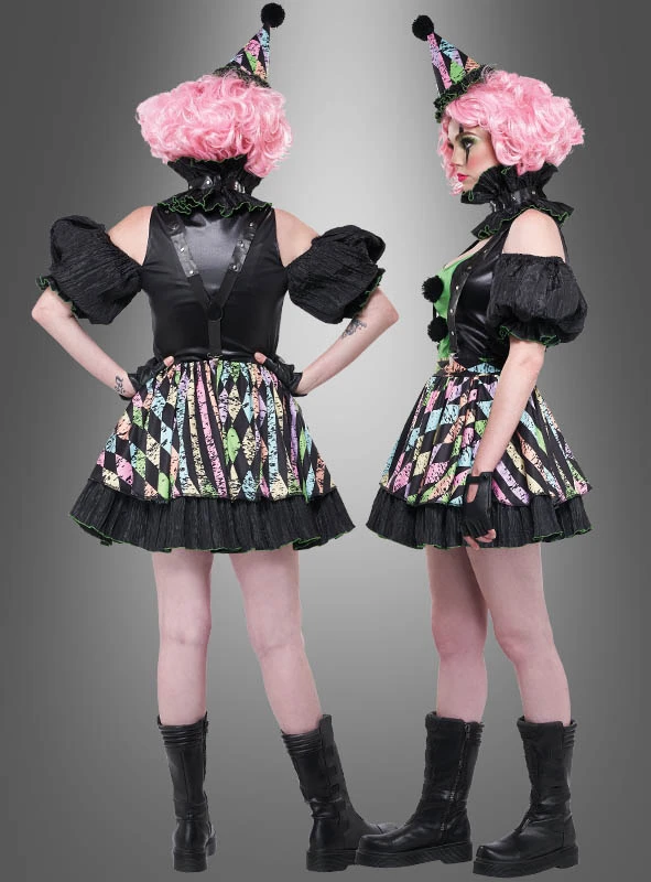 Das Clown Kleid Crazy Nicky Kostüm verwandelt Sie je nach Schminke und Zubehör in einen Horrorclown oder in eine lustige Clownfrau. So haben Sie mit diesem schönen Karnevalskostüm auch gleich eine passende Verkleidung für Halloween.