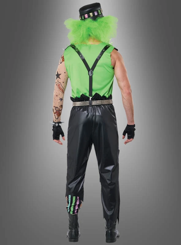 Das gruselige Halloween Clown Kostüm besteht aus 4 Teilen. Auf dem grünen, fransigen Oberteil sind 3 Schwarze Bommel angebracht und auf der rechten Seite ist ein Tattoo Ärmel angenäht. Die schwarze, mit bunten Flecken verzierte Hose wird durch die schwarzen Hosenträger, welche mit Nieten verziert sind an Ort und Stelle gehalten. Der wahre Hingucker des Clown Kostüms ist der schwarze Hut, der dasselbe bunte Muster wie die Hose hat und die grünen Haare die an dem Hut befestigt sind.