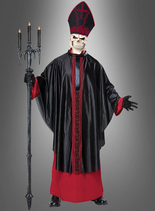 Ein Skelett als Gottesdiener? Im Zombie Priester Kostüm aus unserem Onlineshop gelingt Ihnen die perfekte Verwandlung im Nu. Wundern Sie sich nicht, wenn alle Partygäste bei Ihrem düsteren Anblick niederknien. Im Lieferumfang ist eine hochwertige Totenkopf-Halbmaske enthalten. Sie wird mit einem Gummiband am Kopf gehalten. Das Zombie Priester Kostüm wird mit der mitgelieferten Bischofsmütze aus festem Material vollendet. Totenköpfe und Dornenkranz zieren die Mitra. Hexen, Magier und Geister des finsteren Mittelalters lassen grüßen. Das bedeutet: Gänsehaut garantiert.